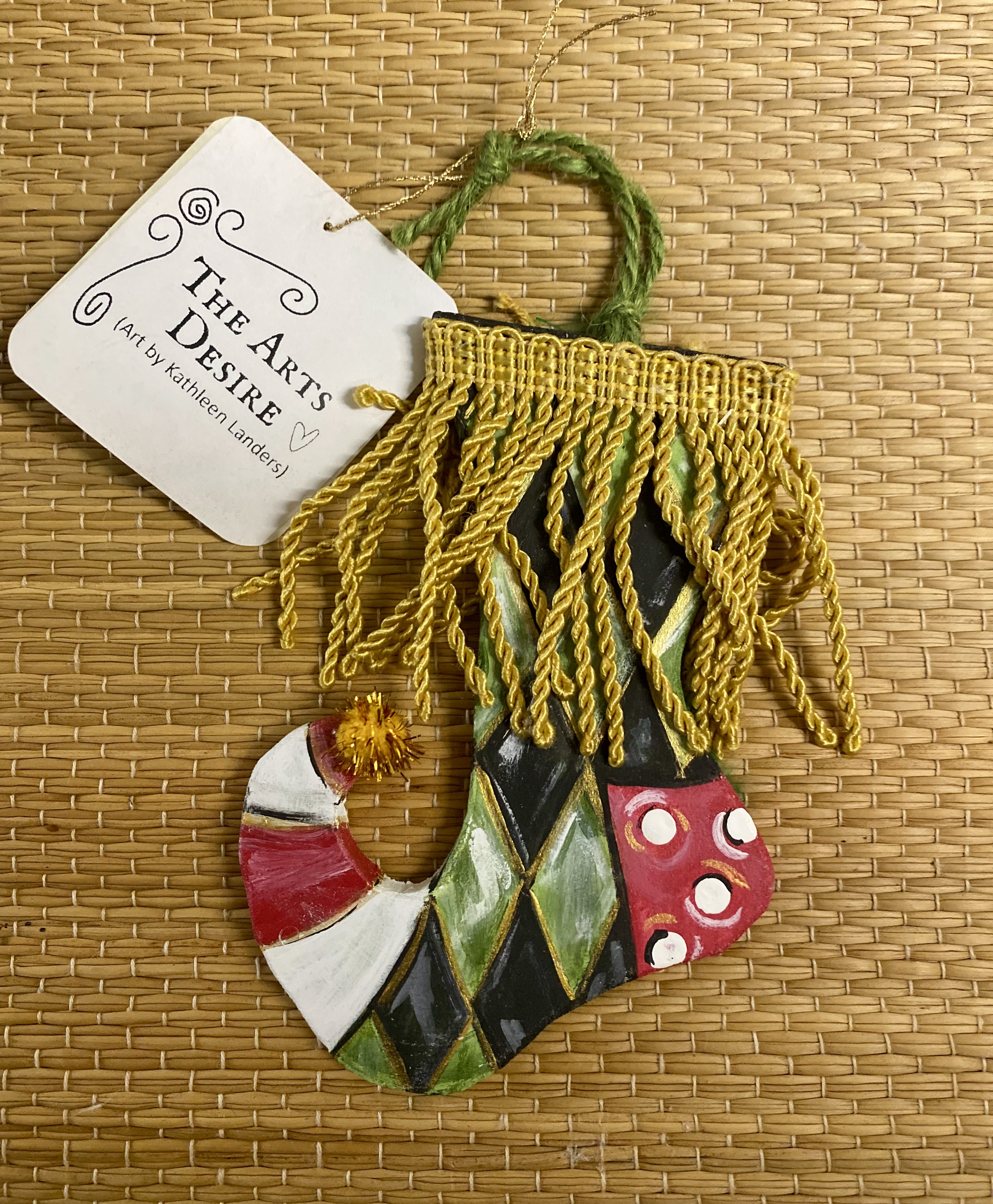 Bring a splash of handmade charm to your holiday tree with this one-of-a-kind wood stocking ornament. Painted in a playful patchwork of red, green, gold, white, and black with shimmering accents, this piece combines cozy nostalgia with a touch of quirky elegance. Each stocking features unique embellishments — like hand-twisted fringe, textured trims, and metallic highlights — giving it a joyful, lived-in feel that celebrates imperfection and creativity.