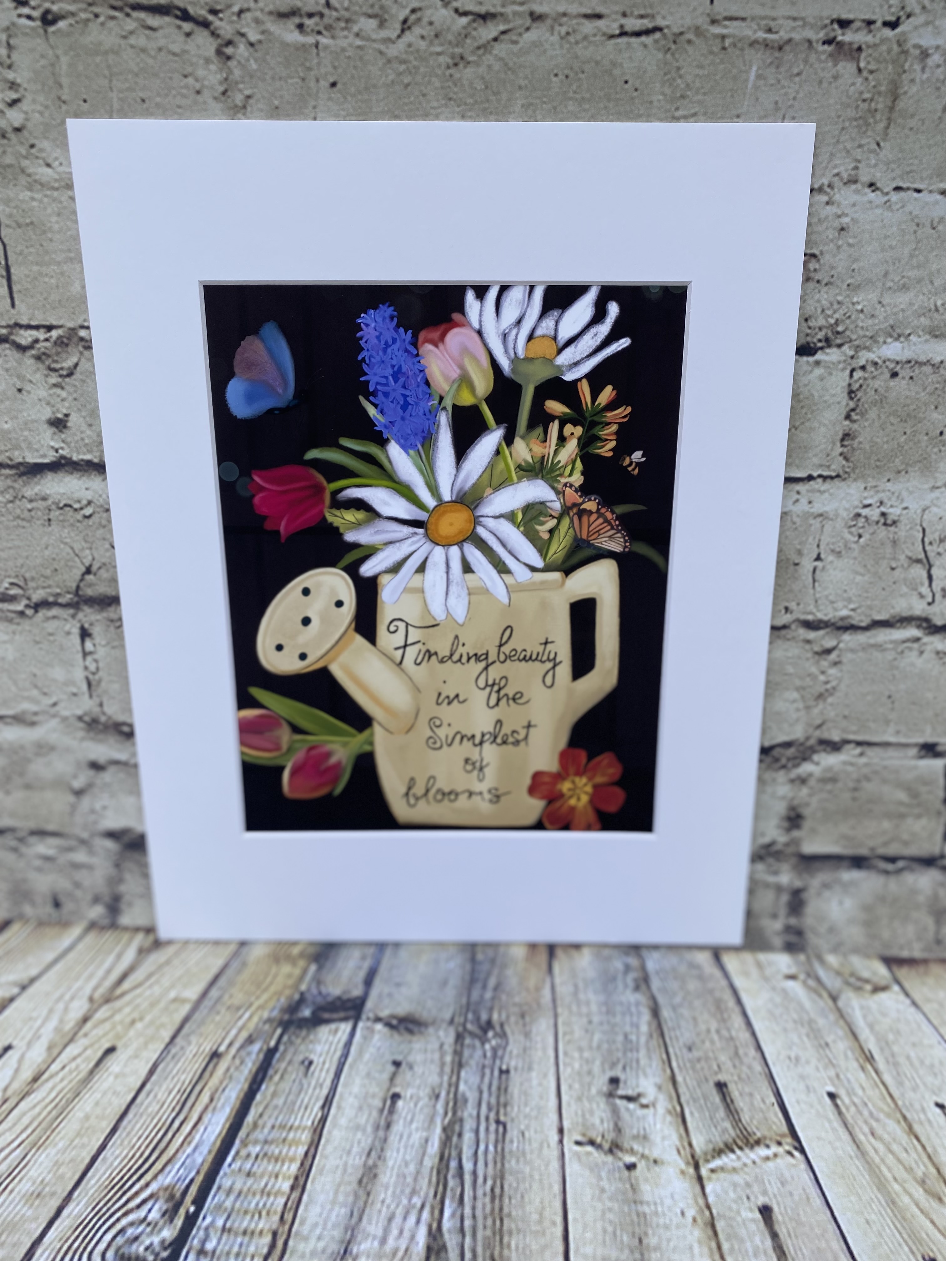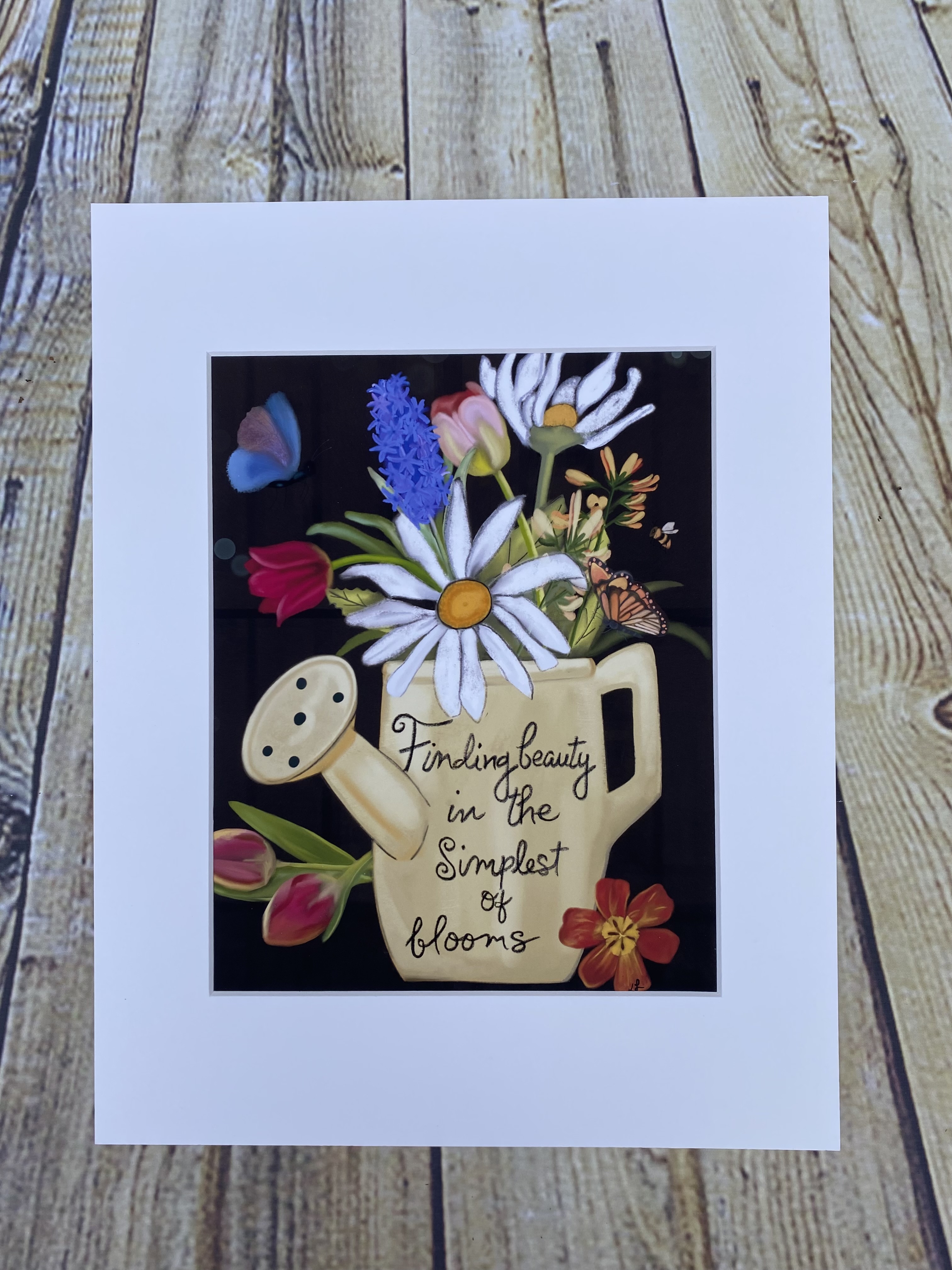 This print has a fun and bright whimsical feel to it. Hand painted digitally with a couple different paint pens, this pale yellow watering can has a casual feeling of just-picked flowers along with butterflies and a bee. The loose line sketching is meant to bring attention to detail in an informal way. The dark background conveys a simple watering can that models as a piece of artwork. Sometimes simple is beautiful.